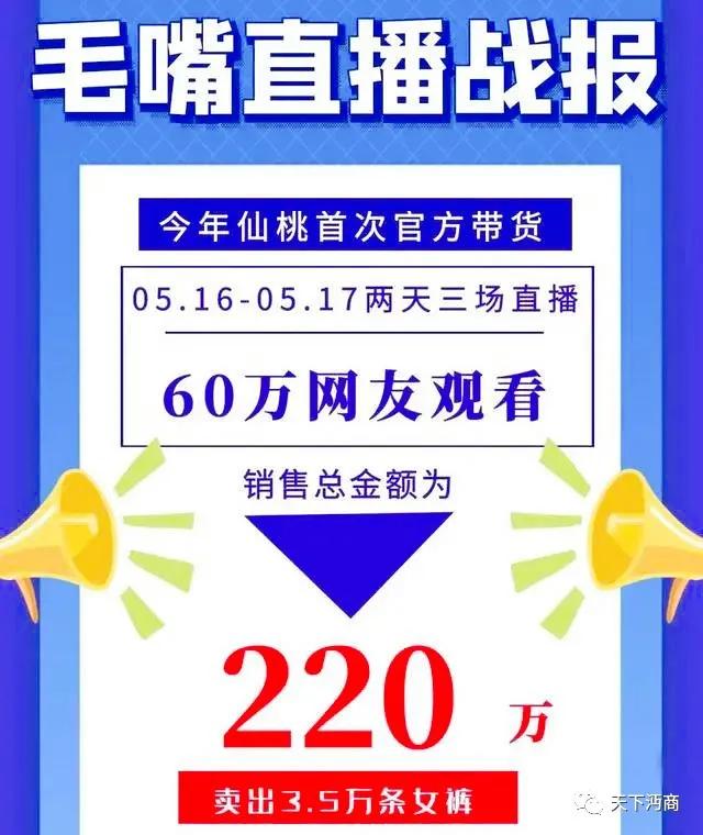 有了官方背书,毛嘴女裤颇受青睐,“爆款”频现。一款牛仔裤连续三次被秒抢,一款正装裤10分钟卖出2000多条。截止5月18日凌晨,随着第三场直播完成,共有60万网友先后涌进直播间,“中国女裤之都”收获3.5万条女裤订单,销售额近220万元。